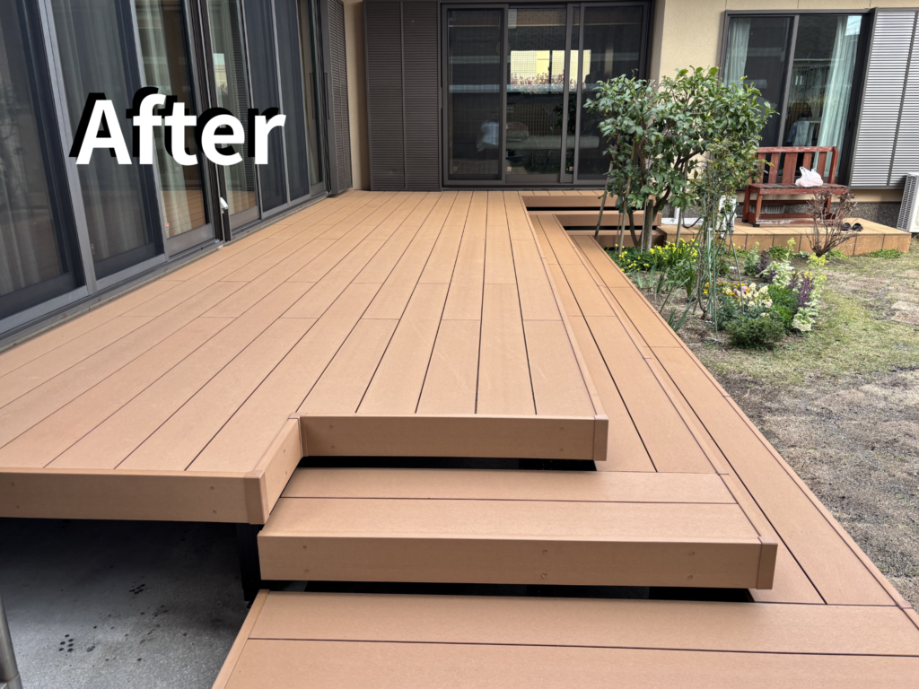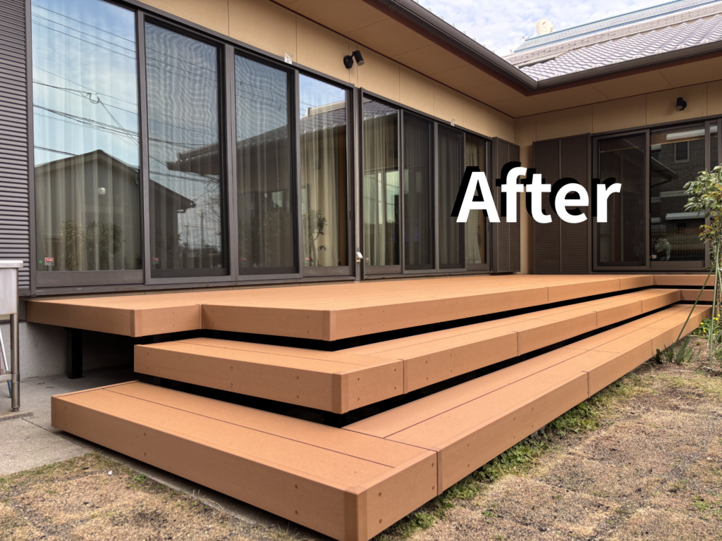 段差を細かくすることで、お庭との行き来がぐっとスムーズになり、足元の負担も軽減されました。無理のない高さで安心して昇り降りができるため、安全性が大きく向上していると思います!さらに、段床が増えたことで腰掛けたり、ちょっとしたくつろぎスペースとしても活用でき、より快適にお庭時間を楽しめる空間となりました。